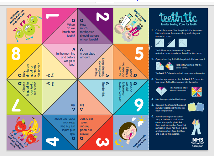 The snapper game is a paper fortune teller with 8 questions to test your oral health knowledge. Simply print it out, follow the folding instructions and you’re ready to play!